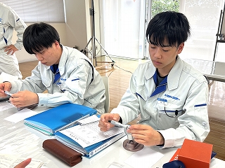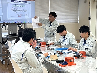 現場研修を目前にして、さねちゃんから「測定器の取り扱い」についての研修を受ける新入社員たち。