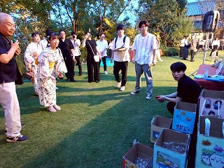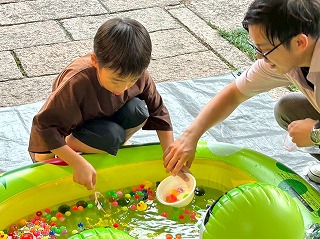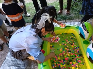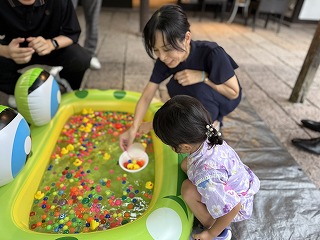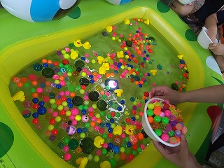 日影となる藤棚の下に陣取り、「スーパーボールすくい」開店です! |