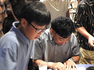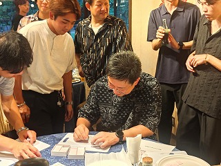 みんなで試行していると、会長が見に来てくださいました。 すると、会長もチャレンジしてくださることに! 残念ながら惜しいところで割れちゃったそうですが、めっちゃ惜しかったそうです。 そうなんです! |