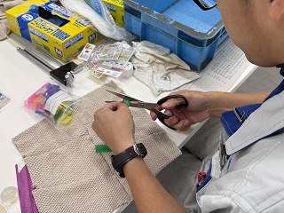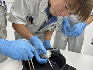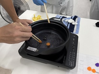 薄くてかたちの出にくい製品は、金型ごと鍋にいれて温めながらかたちにしました。 みなさん本当に製品を作っているかしているかのように真剣に作っていました。 筆者もツバ付き製品のスーパーボールをいくつか作りましたが難しかったです。 ねんどが冷えて固まったら、ハサミを使ってかたちを整える工程へ進みます |