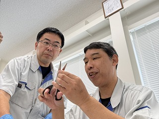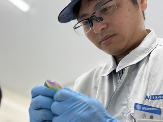 最後に、製品の品質検査です。金型通りにスーパーボールができているかや、バリや空気が入っていたり、亀裂が無いかのチェックを行います。 おぐさん、真剣なまなざしです。 |
