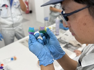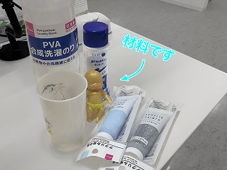 ですが、今年のサマーパーティー開催時期の9月にはカブトムシさんがいないのでビートルプロジェクトは断念するしかありませんでした。しかし、例年のようにお子さんたちに楽しんでもらいたいという気持ちから、会議の末に夏の風物詩…「スーパーボールすくい」をすることに決まりました! ただ、買ってきたスーパーボールを浮かべるだけでは生産技術係らしさが出ません。 そこで考えたのが”金型を使用して当社製品のかたちをしたスーパーボールを作る”ことです!! 会議の数日後、早速ごとーさんが塩や洗濯のりを使った、試作1号を作ってくれました。 |