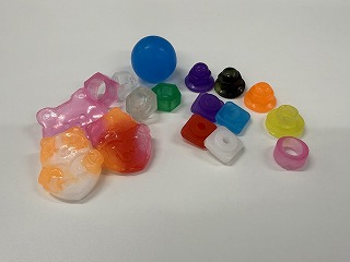 まるーくキレイに作れた試作1号ですが、製品のかたちにするのは難しく、水にも溶けやすいという欠点がありました。 スーパーボールすくいは水に浮かべて遊ぶものなので、残念ながらこれはボツに。 |