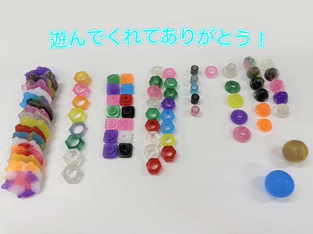 そこで、試作2号は洗濯のりから市販のプラねんどに変更しました。 これは熱湯でしか柔らかくならないので、スーパーボールすくいをしていても水で溶けることはありません。これなら家に持ち帰った後もお風呂で溶けることなく遊べます! これならいけるだろう!と量産準備に入っていきました。 |