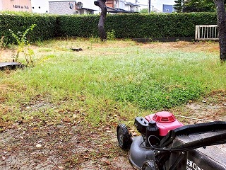 正門横のスペースは運動会当日、「自転車置き場」となるのですが、ご覧の通り、雑草だらけ。 ここはいつもの芝刈り機を投入! |