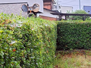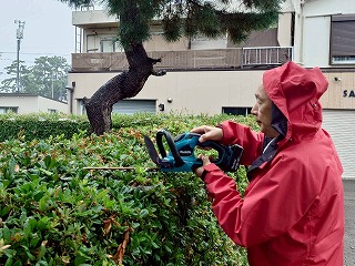 この剪定、電動剪定機を使っているのはいいのですが、この体勢がけっこうキツイ! |