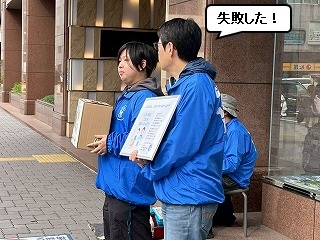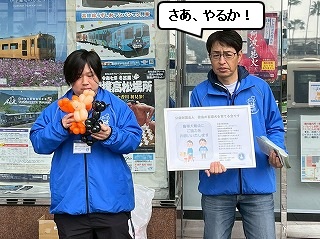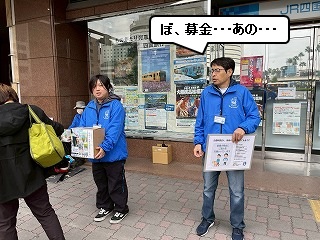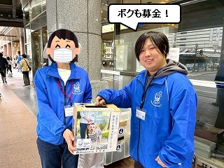 まるちゃんとかわいさん、久しぶりの街頭募金活動に緊張の面持ち。 |