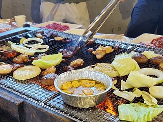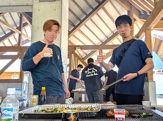 このバーベキュー大会では、各テーブルに支給される食材以外にも、各自で色々なものを持ち込んで楽しんでいます。