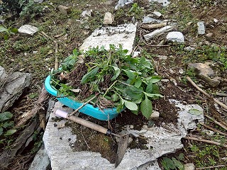 いよいよ除草開始。 場所的に草刈り機は持ち込めないので全て手抜きか、片手持ちの草削りでの作業です。 |