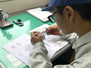 「ノギス」という測定器を使って、製品の寸法測定をしてもらいます。