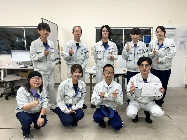 成型4係での朝礼に続いいては、製品測定!