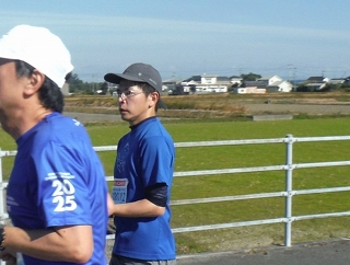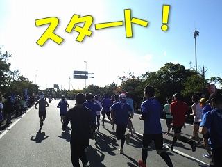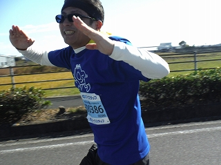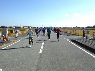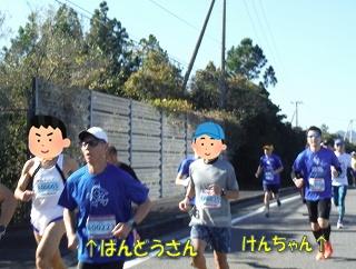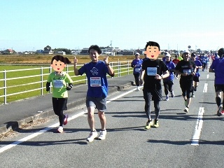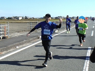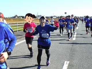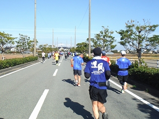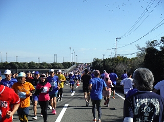 午前10時、号砲が鳴り、小松島逆風ハーフマラソンがスタート! 今年は「逆風」あるかなぁ。 このコースは4つの折り返しポイントがあり、けっこう仲間たちと出会えます。 |