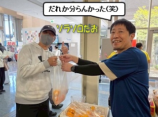 会社の仲間たちも買いに来てくれました! ソラソロさんとすずえマンは、「社内スローピッチ大会」終わりに駆けつけてくれました! |