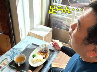 ハンバーグ定食を瞬食するカズキング。 カズキングの食欲をナメてはいけません。 当然、サイドメニューも物色していきます。 |