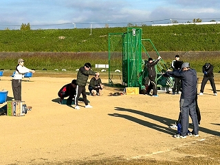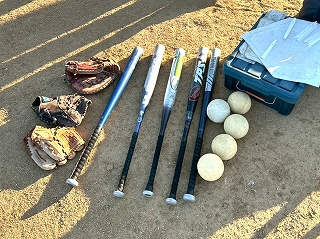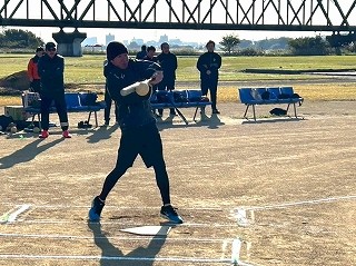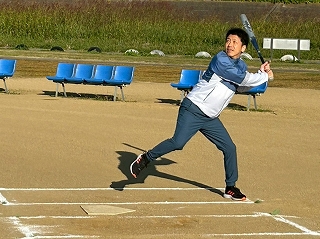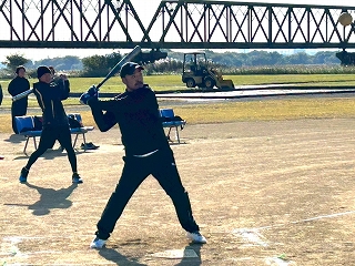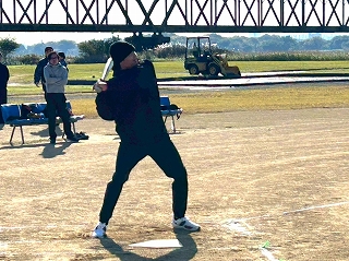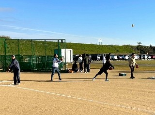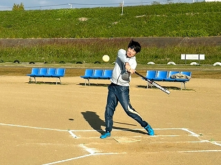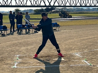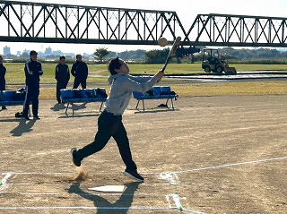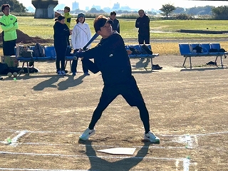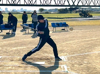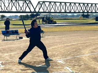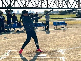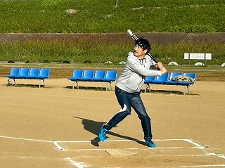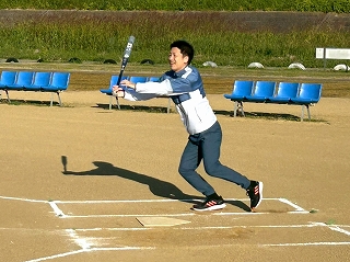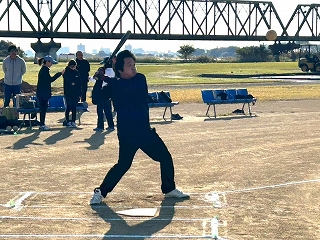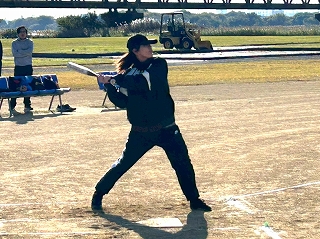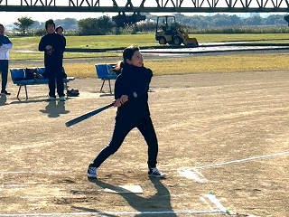 いかにもかっ飛ばせるバッティングフォームをしている、おかもとさん。 スローピッチ用の大きくてやわらかいボールを外野まで持っていきます! |