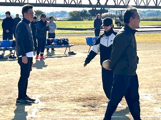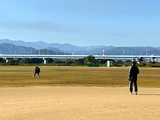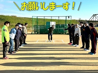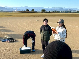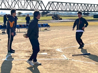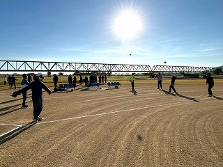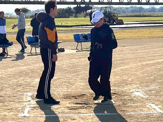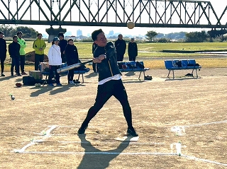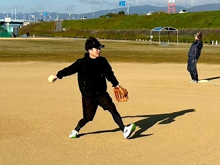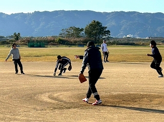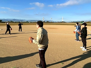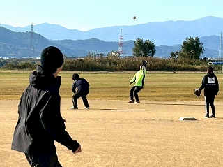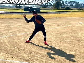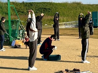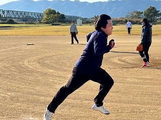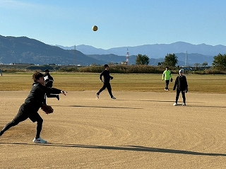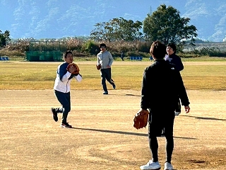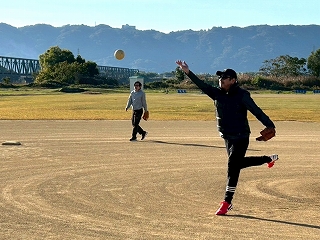 試合前、みんなでキャッチボール! ちゃんとボールを投げて、肩をつくっておかないと、翌日に腕が上がらなくなっちゃいますからね。 |