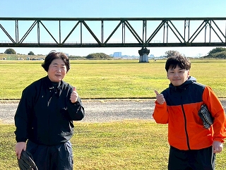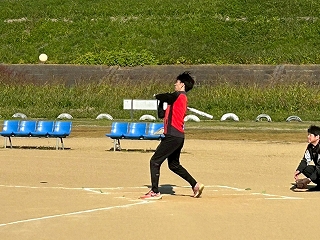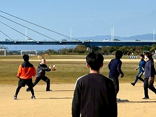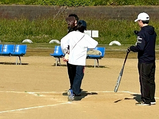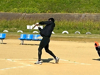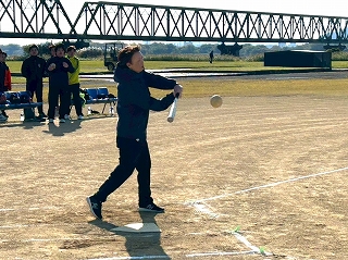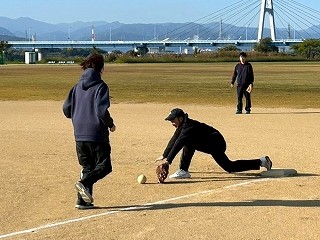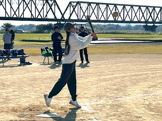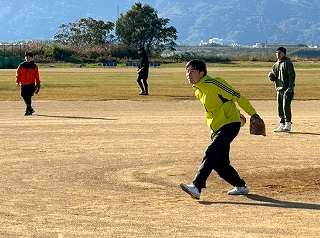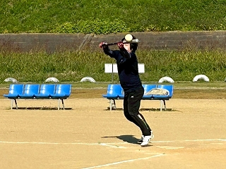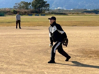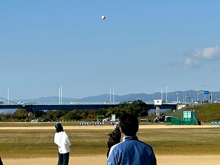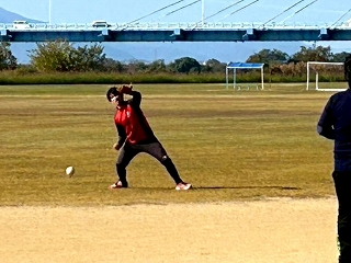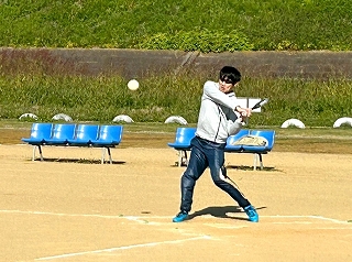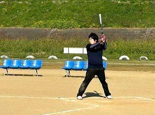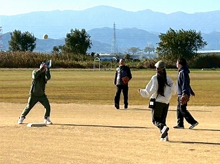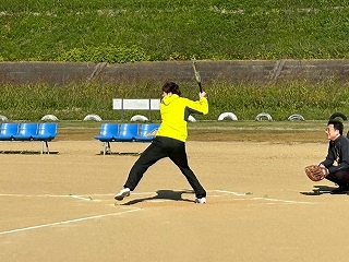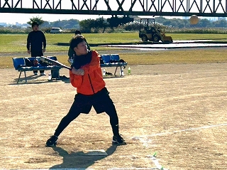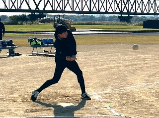 ①チームの2試合目は、酒豪なかざとさんがピッチャー。 その酒豪ユニコーン、先輩の元ソフトボール部かわのさんをあっさり打ち取ります。 |
