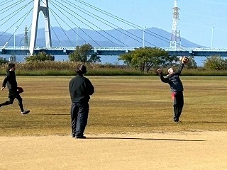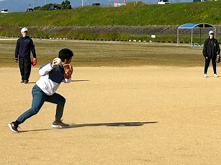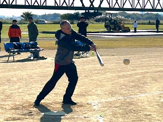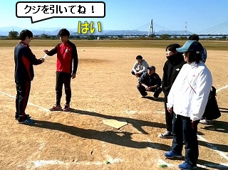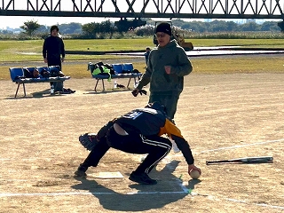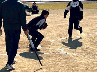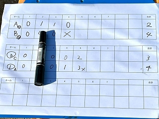 最終回、ついに③チームの打線に火が付きました! ①チームのキャッチャーよしたけさん、あやうく「半○ツ」になりながらもがんばりますが、③チームの勢いが勝ります。 見事に打線がつながり、「2点」をGETして「4対2」とします。 最終回の得点だけに、これで勝負あったでしょう。 |