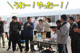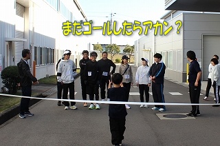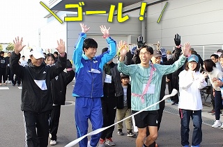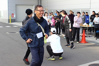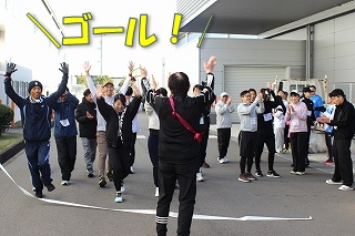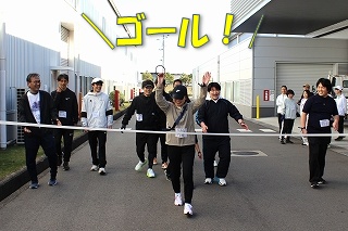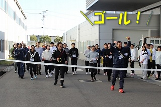 11月末に行われた「社内リレーマラソン大会」の様子を紹介しています。 いよいよ各チーム、ゴールの瞬間を迎えます! チームカラーのたすきをつけているのがアンカー。 社長もバトンでちょけてくれました! |