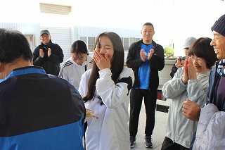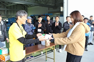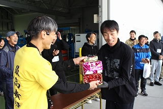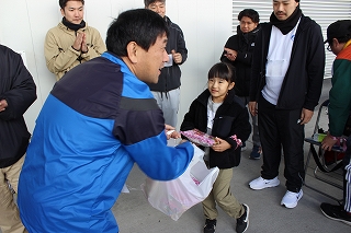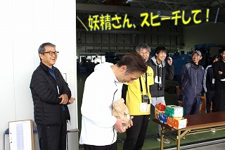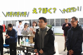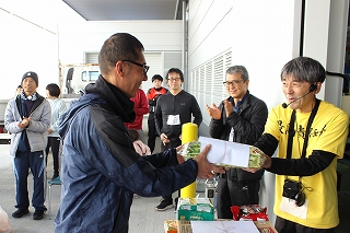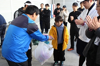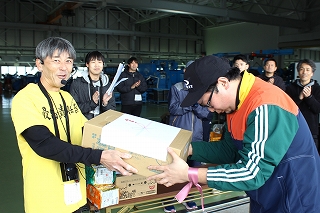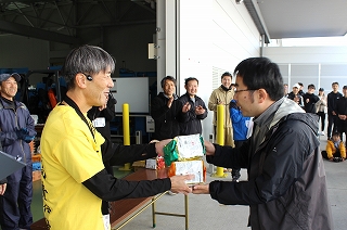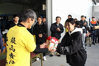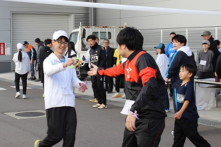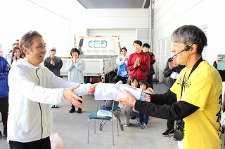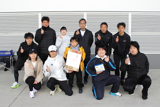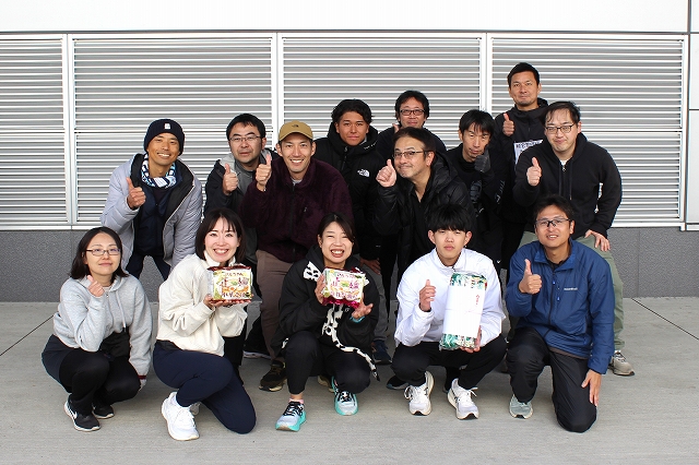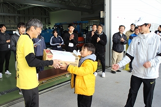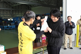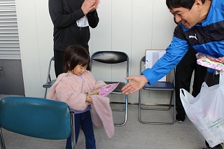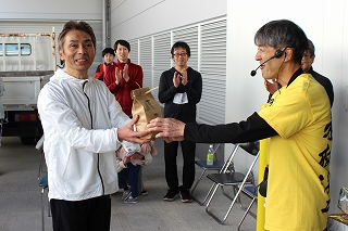 まずは、社員みんなと一緒にがんばって走ってくれた、お子さんたちにプレゼント♪ 4人とも、めっちゃがんばって走ってくれて、場を盛り上げてくれました! ありがとうございました! |