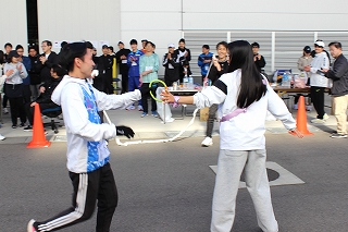そして、ようやく紫チームがアンカーにバトンパス! はたして、その「差」はいかに? 他のチームの拍手の中、紫リボンチームがゴール! |