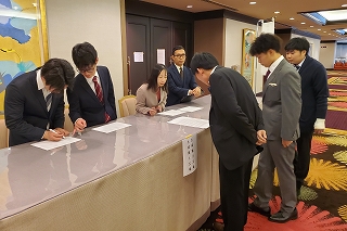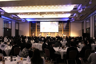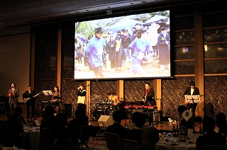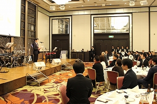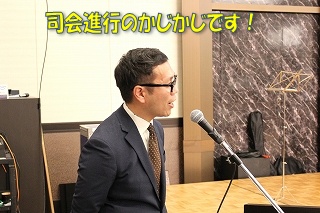 今年の司会進行は、かじかじが担当! 笑顔がステキなかじかじ。 でもこの時は、めっちゃ緊張してたそうです! そろそろ開宴の時間です。みんなが着席していきます。 |