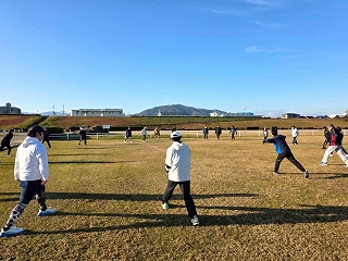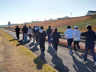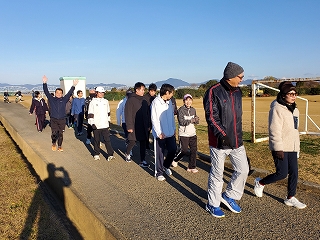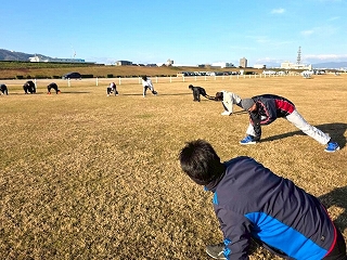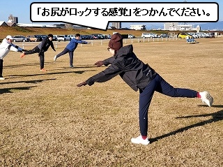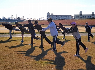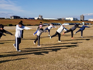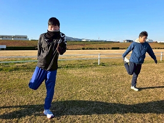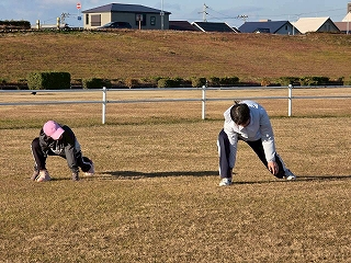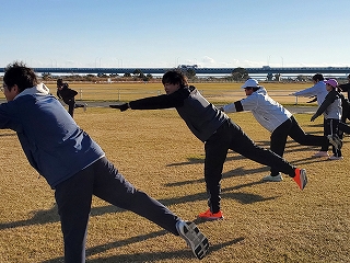ウォームアップ・ウォーキングが終わったら、次はストレッチ! ランニングでケガをしないよう、しっかりとストレッチで体をほぐしていきます。 |