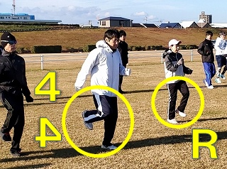 ここでちょっと、まるちゃんに犠牲になってもらいWも解説。 Wがよく伝えている「Rラン」。 まるちゃんの両横、すぎおかさんとはやしさんの足の動きはキレイな「R」の形になっています。 しかし、まるちゃんの足の動きは「4(の逆さま)」になっています。 |