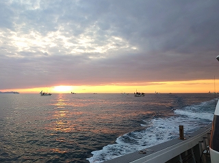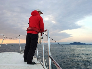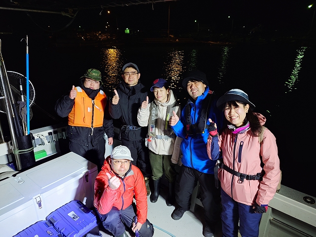 真っ暗の海に浮かんでいるのは、乗合釣り船。 この日、西精工の釣り仲間たちが、鳴門で釣りを楽しみましたー! 今回のメンバーは、にしさん親子、石ちゃん夫妻、みきさん、そして魔法を使える校長先生の6人です! |