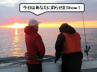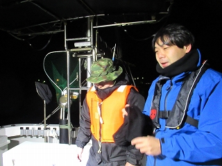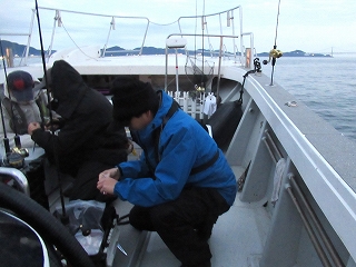 夜明け直前、空が白んできました。 ベテラン勢は各自、釣りの準備を始めます。 にしさんは、息子さんに釣り方をレクチャー。 |