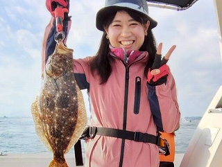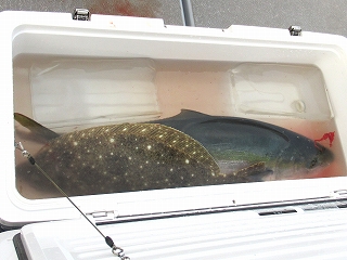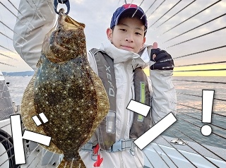 すると・・・ いきなりこんなことが! にしさんの息子さんが、スゴイ獲物(ヒラメ)を釣り上げました! |