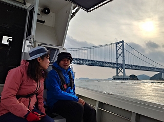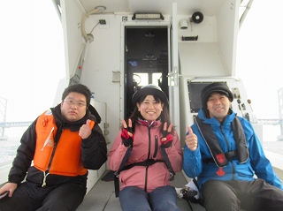 さすがの厳冬期、ポイントまでの移動中は船の中。 |