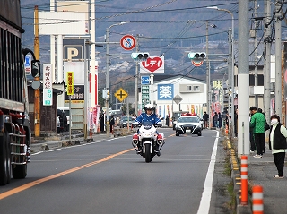 車の流れが無くなり、宣伝カーが通った後、白バイとパトカーが見えてきました! |