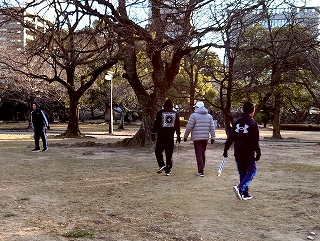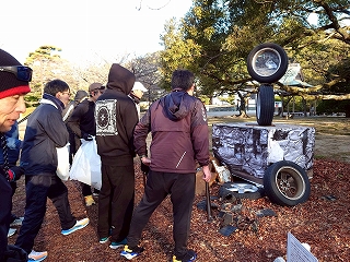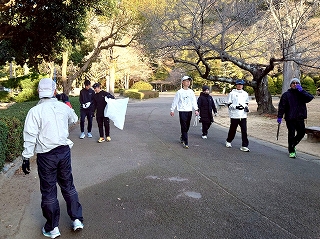 歩道橋を渡り、徳島中央公園に到着! まずはみんなで徳島中央公園の清掃活動を行いましょう! 清掃道具はランモンおがささんが車で搬入してくれていました。 |