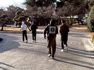 さあ、清掃活動に続いては、リレーマラソンの練習です! 「一周=1500メートル」のコースを、各自のペースで走ります。 この「1500メートル」という距離は、マジしんどい! |