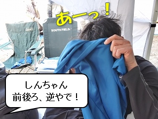 たいてい、ゼッケンをつけるシャツは「着ないで持ってくる」のが定石なのですが、中には「着てくる」人もいます。 そうそう! |