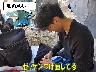 受付を済ませると、ゼッケンをいただけます。 各自、胸の下あたりにゼッケンをつけます。 ・・・って、寝てる人もいますね(笑) |