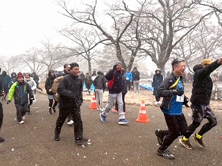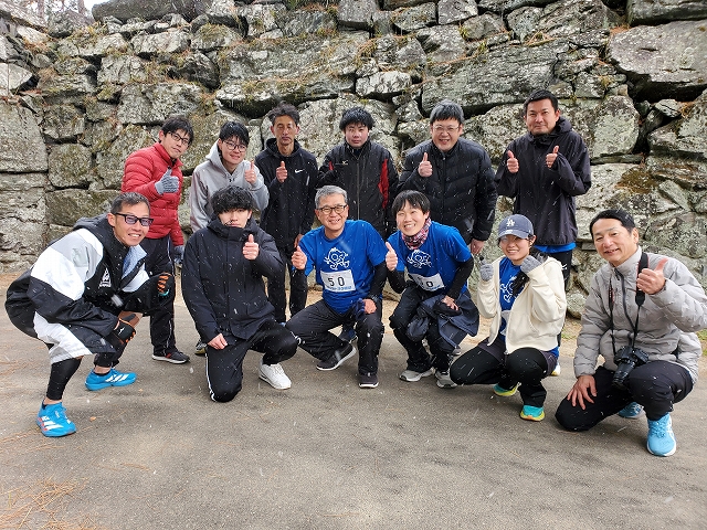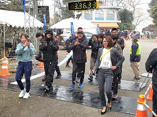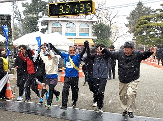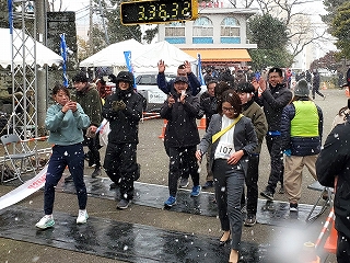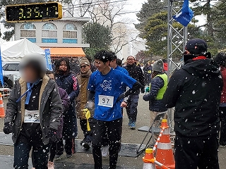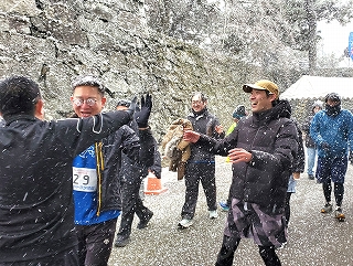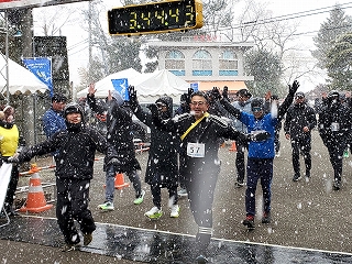 雪がガンガン降ってくる中、「ウエストカンパニー」チームのアンカー、社長が走ってきました!