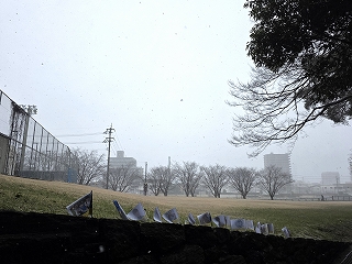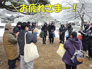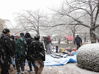 みるみる雪が積もる中、みんなで急いで撤収!