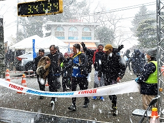 とてつもなく雪が降る中、「ウエストカンパニー」チームがゴール!