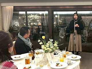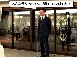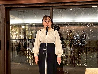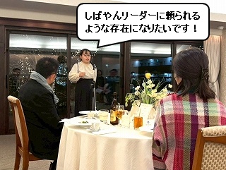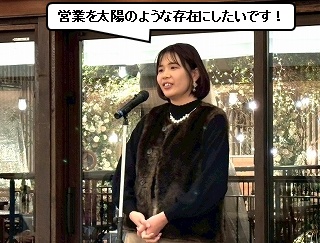 それではここで、新年会恒例の決意表明! まずトップバッターは、なみちゃん! なみちゃんからは、 「HTT 先輩が育休中の今、これをチャンスとして、仕事を一人でやり切れるようになります! と、頼もしい決意表明をしてくれました! |