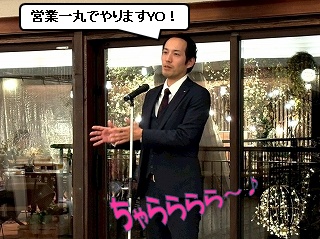次は、シラフなのに異常にテンションが高い、かっちゃん! かっちゃんからは、シンプルですが、力強い決意表明をしてくれました! 「新製品の新規成約を取ってきまーす!」 |