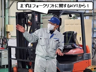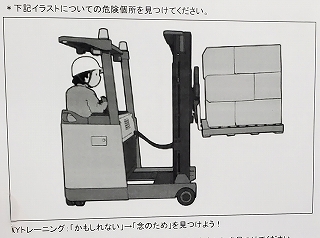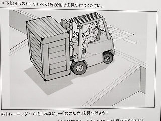 まずは「フォークリフトに関するKYT」から。 K:危険 「危険予知トレーニング=KYT」! 普段の何気ない風景の中から、危険な箇所を見つけ、どう危険を回避するかを考えるトレーニングです。 |