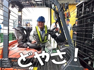 それではここで、みんなを代表して、ワルタk・・・ごほごほっ! みんなを代表して、よしたけさんがフォークリフトに乗り込んでくれました! |