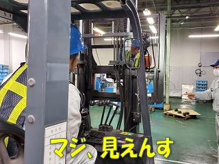 話を聴くのと、実際に自分の目で確認するのとでは大違い! 「百聞は一見に如かず」とは、よく言ったものです。 フォークリフトの運転手が注意して走行するのはもちろんですが、歩行者も「運転手は前がよく見えていない」ということを理解し、フォークリフトには近づかないことが大切です! |