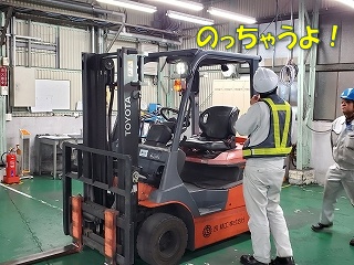 周囲の確認後、かなりの「どや顔」でフォークリフトに乗り込んだ、かずおちゃん! |
