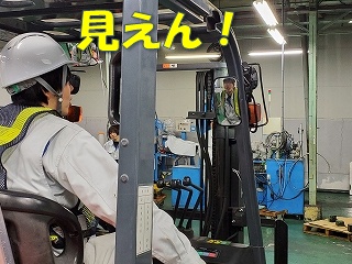 続いては、フォークリフトがいかに視界の悪い乗り物なのかを説明。 |