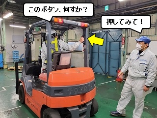 それではここから、本物のフォークリフトを使っての安全レクチャーとなります。 「お手本」として、かずおちゃんがフォークリフトに乗り込みます! かずおちゃん、「お手本」ですからね! 「お・て・ほ・ん」 |