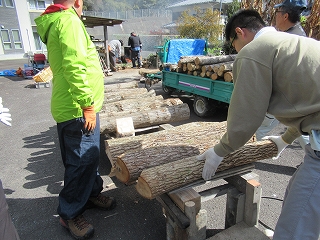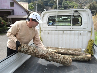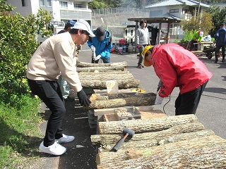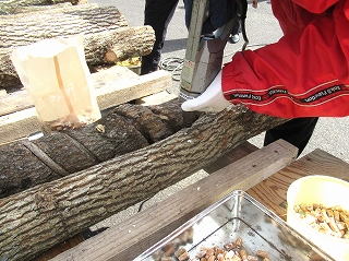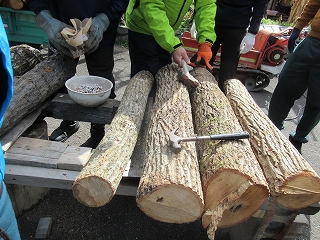 まずは地元の方が作業の手順を教えてくださいます。 丸太の原木を作業台に並べていき、登場したのは「しいたけの菌」。 |