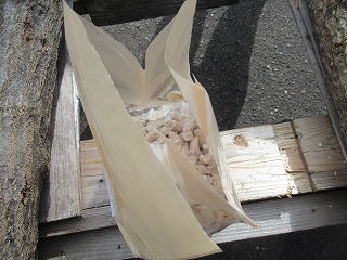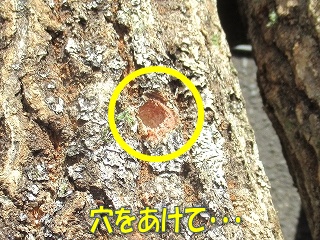 まずは原木にドリルで穴をあけ、あいた穴に種駒を挿入します。 種駒は差し込むだけじゃ落ちちゃうので、ハンマーを使って強く差し込みます。 |